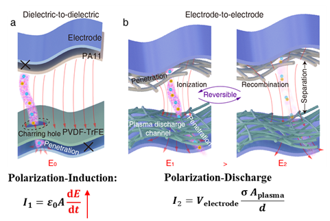 近日,东华大学材料科学与工程学院、先进纤维材料全国重点实验室王宏志/侯成义课题组提出了一种基于静电击穿效应的能量释放机制,并据此开发出等离子体增强能源纺织品(Plasma-Enabled Energy Textile, PEET)。该研究揭示了在介电极化与静电感应之间,存在一条被忽视的高效能量传递路径:通过可控的电介质击穿形成微等离子体通道,将缓慢的位移电流过程转化为快速的传导电流过程,实现了能量的快速释放与高效转换。