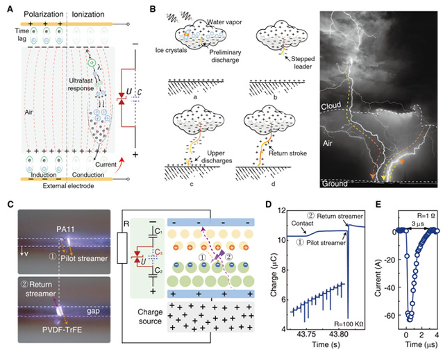 该工作中,研究人员受自然闪电放电过程的启发,模拟了其中的“回击”(return stroke)机制。在自然闪电中,电荷在导电通道形成后会沿着既有路径迅速反向流动,释放出巨大的能量。团队将这一思想引入纺织结构中,在纤维间构建稳定的等离子体微通道,实现可重复、可控的放电路径。等离子体通道在放电后会产生“记忆效应”,显著降低回击的阈值,使系统能够在较低外场下实现稳定的放电与能量释放。