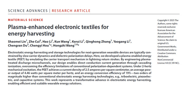相关研究以“Plasma-enhanced electronic textiles for energy harvesting”为题发表在学术期刊Science Advances(Sci. Adv. 2025, 11,eadx2628., DOI: 10.1126/sciadv.adx2628)上。东华大学材料科学与工程学院博士生林绍妹为第一作者,通讯作者为王宏志教授和侯成义研究员。该研究获得了国家自然科学基金委员会、东华大学励志计划等多方面的资助与支持。