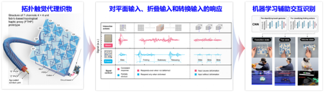 在“拓扑设计与沉浸式交互系统”层面,与信智学院张光林团队跨学科合作,突破传统人机交互中物理道具与虚拟资产“一对一”绑定的局限,提出“纤维拓扑触觉代理(FTHP)”架构。受折纸启发,团队通过在柔性织物中嵌入非均匀刚性单元并集成S/Z双捻摩擦电传感纤维,将复杂的物理交互编码为可分类的特征电信号。这种拓扑约束确保了单一纤维表面可动态重构为平板、三角柱或立方体等多种交互终端,且信号鲁棒性高。结合轻量化神经网络(CNN),系统在14种交互动作中的识别准确率达到92.4%,成功演示了在模拟空间探索任务中的多模态指令控制,展现了纤维系统在元宇宙交互领域的巨大潜力。(National Science Review, 2026: nwag041)