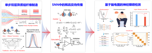 在“制造策略与脑启发计算”层面,团队针对神经形态硬件训练中梯度不可微与高功耗瓶颈,提出“溶剂互扩散固化纺丝(SISS)”策略:通过精准调控溶剂扩散动力学,克服Plateau–Rayleigh不稳定性,制备出具有清晰异质结界面的同轴三层半导体纤维。基于该纤维构建的可调谐织物基垂直有机电化学晶体管(TT-vOECT)能直接模拟Sigmoid导数特性,实现硬件级的替代梯度计算。进一步,团队提出“条件激活反向传播(CAB)”机制,利用双TT-vOECT构建的可重构逻辑阵列,实现了稀疏、事件驱动的权值更新,在脑电信号(EEG)疾病诊断中达到软件级分类精度的同时,减少了约20%的计算冗余,为柔性神经形态硬件平台奠定了基础。(Advanced Materials, 2025: e14904)